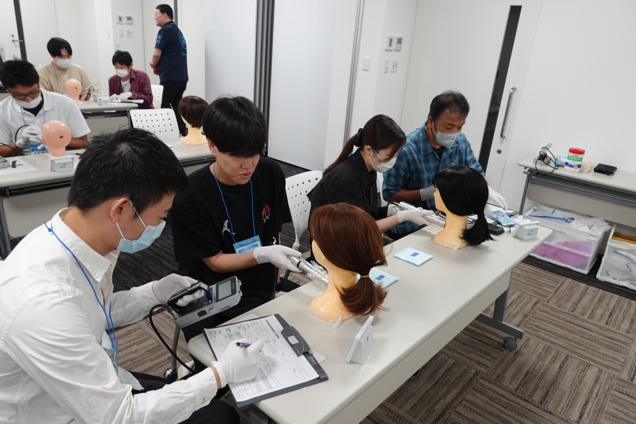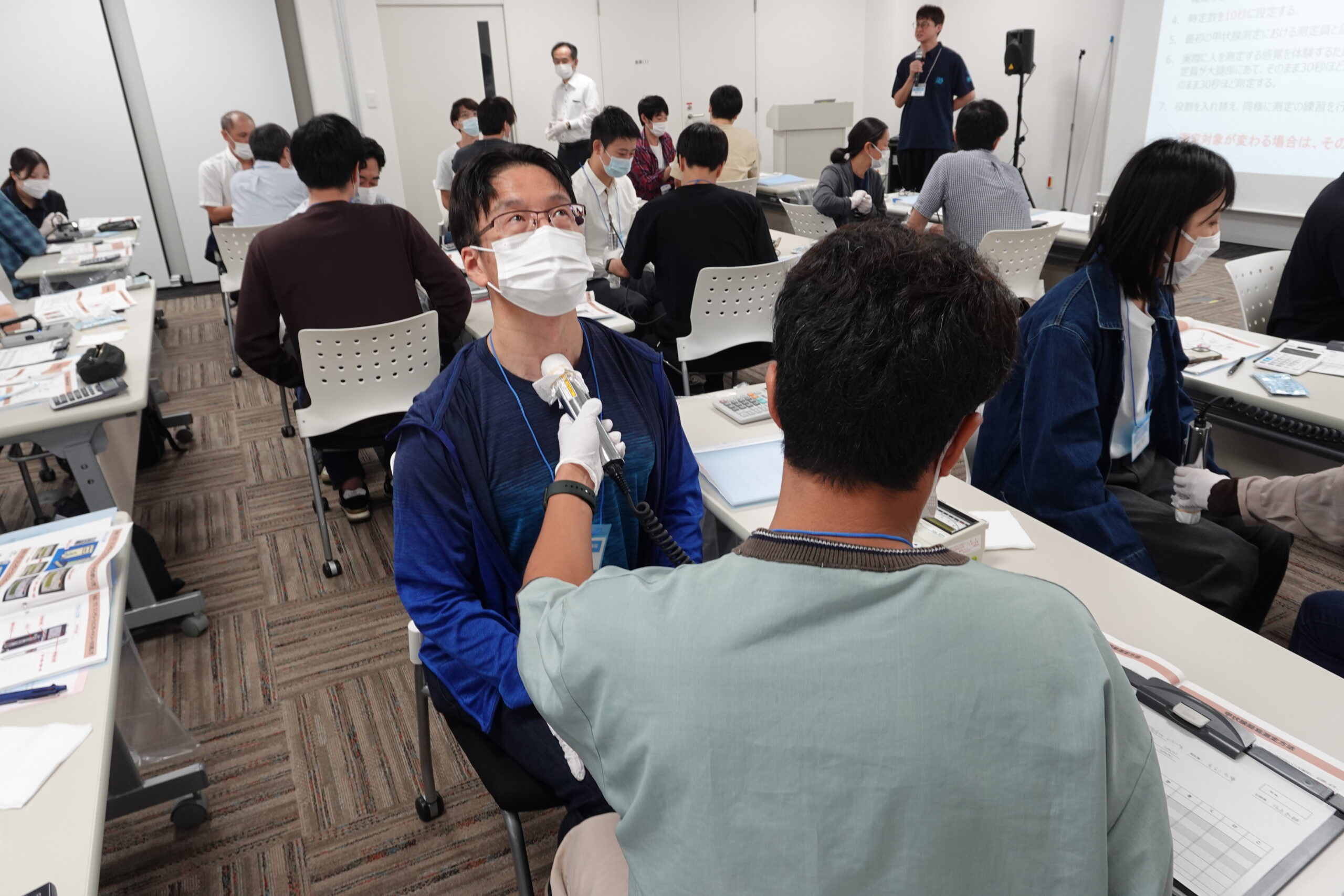 令和7年度第3回甲状腺簡易測定研修を佐賀県佐賀市で開催し、診療放射線技師24名に参加いただきました。第1回および第2回と同様に測定実習では二人一組となり、シンチレーションサーベイメータで互いに測定しあうことで「測定される側」を体験したり、マネキンを用いた測定では一連の手技等を確認しました。